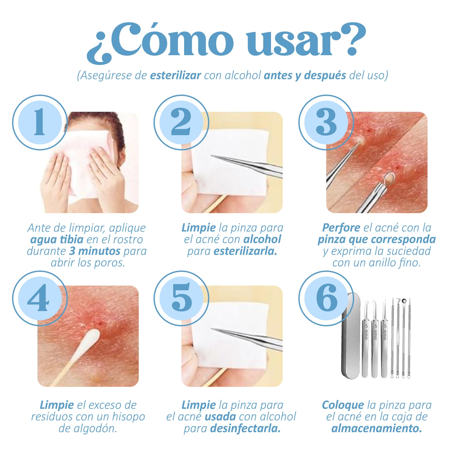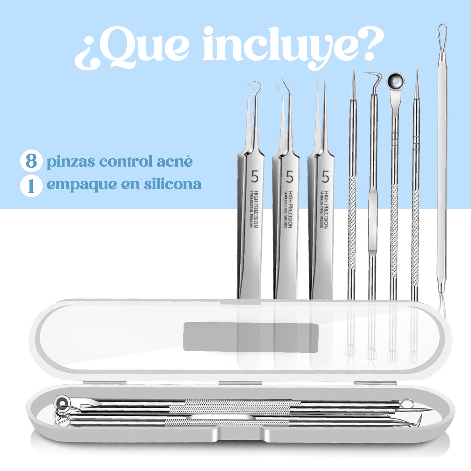El kit incluye 8 herramientas diferentes, con 13 puntas diferentes cada una diseñada para tratar distintos tipos de espinillas y puntos negros. También viene con un estuche compacto para transportarlas.